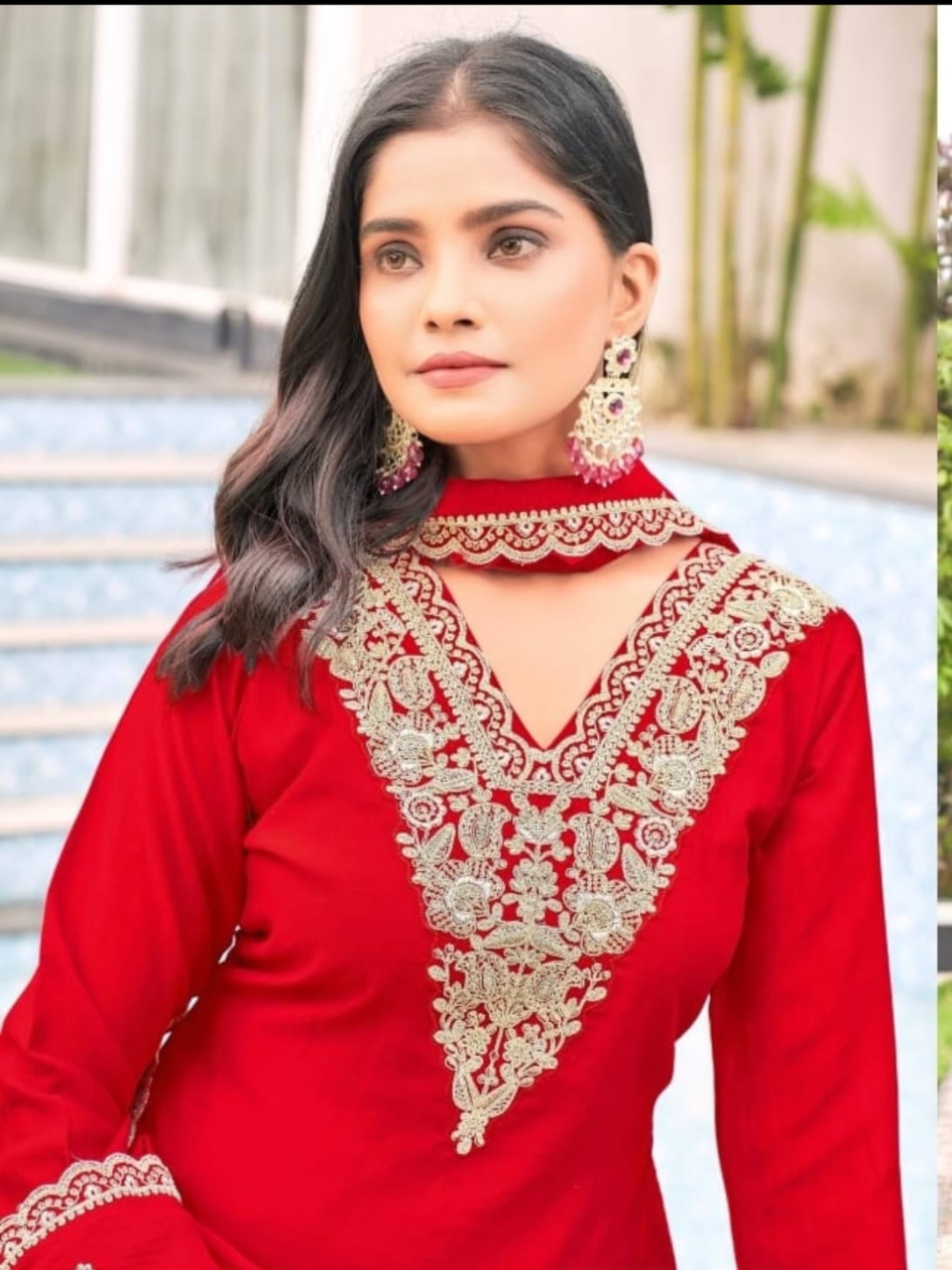 Turn heads in this elegant Red Hot Semi Silk Suit Set, featuring exquisite embroidery on the neck, kurta hem, and dupatta. Comes with matching pants and a beautifully detailed dupatta for a complete festive-ready look.